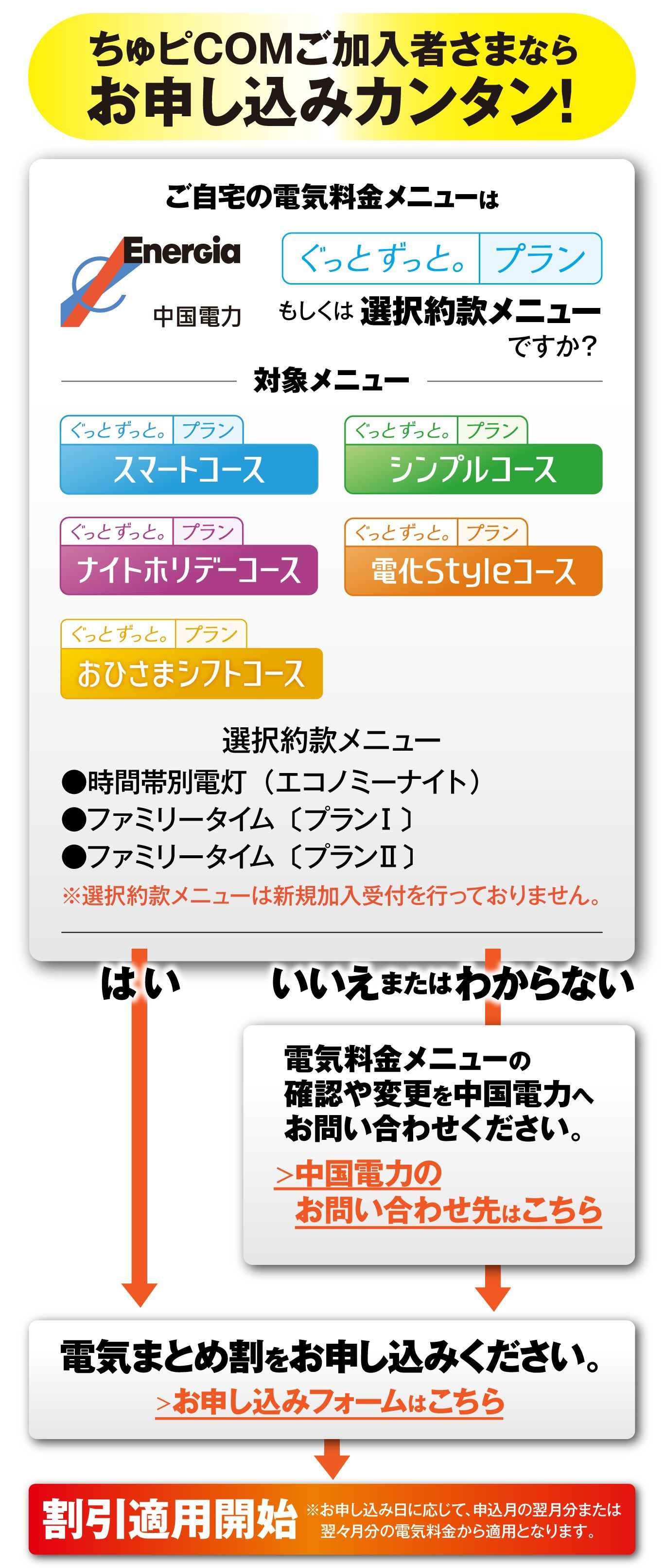 | ■中国電力 | 以下の電気料金メニューにご加入いただいているお客さま ※電気料金メニューの詳細については、中国電力のHPもしくは中国電力カスタマーセンターへご確認ください。 |