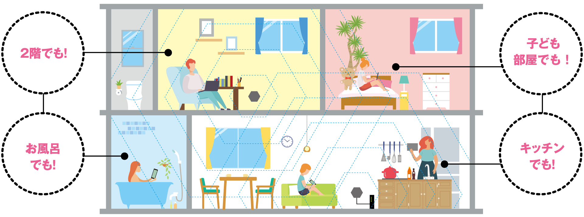 2階の部屋など、今までWi-Fiが届きにくかった場所もつながります。動画再生なども、Wi-Fiが家全体をカバーしているから、どこにいてもフリーズすることなくスムーズです!
