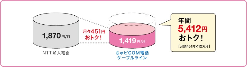 月額基本ご利用料金1,419円(税込み)※1。NTT西日本の加入電話:1,870円(税込み)※2と比べると、