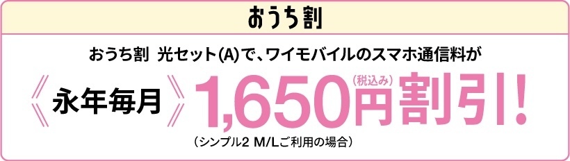 【適用条件】○ワイモバイル指定窓口に本割引をお申し込みいただくこと。 ○個人のお客さまであること。 ○モバイル通信サービスを対象料金プランでご利用中またはお申し込みいただくこと。 ○固定通信サービスを対象料金プランでお申し込み後180日以内に固定通信サービスが契約成立(開通)をすること(契約成立確認はおうち割 光セット(A)申し込み翌月より毎月1~2日の契約成立確認期間に行います。) ○お申し込みのお客さま、またはそのご家族が対象固定通信サービスの契約者で指定オプションをご利用中またはお申し込みいただくこと。 ※ご家族の方が本割引をお申し込みの場合、対象固定通信サービス契約者のご家族であることを証明できる確認書類が必要です。 〇お申し込みのあったモバイル通信サービスの回線数が、対象固定通信サービス1回線に対して10回線以内であること。 〇本割引お申し込み時に対象固定通信サービスの支払方法が登録されていること。 【特典】○適用条件が確認された当月利用分より割引を適用します。 ただし、契約成立確認期間までにモバイル通信サービス回線を解約された場合、適用条件を満たさないため 割引を適用することはできません。また、契約成立確認期間中におうち割 光セット(A)を解除および再申し込みした場合、再申し込みした翌月より契約成立確認を行います。 ○以下の割引、キャンペーンと重複して割引を適用することはできません。● おうち割 光セット(A)申込特典(重複する場合、本割引が優先して適用されます。)●光おトク割 ●家族割引サービス ●Wi-Fi セット割 ●タブレット割引(スタートキャンペーン向け) ○ケーブルラインでは、シンプル2 S/M/L以外の対象料金プランは適用できません。【特典適用終了について】○以下のいずれかに該当する場合、当該事実が確認された当月利用分をもって割引の適用を終了します。 ● モバイル通信サービス回線を解約した場合 ●モバイル通信サービス回線を対象外料金プランに変更した場合 ●対象固定通信サービスや指定オプションの変更、解約、譲渡などにより、適用条件を満たさなくなった場合 ○以下に該当する場合、当該事実が確認された当日をもって割引の適用を終了します。 ●モバイル通信サービス回線を譲渡した場合 ○以下に該当する場合、当該事実が確認された時点で「おうち割 光セット(A)」の申し込みをキャンセルします。 【申し込みのキャンセルについて】●固定通信サービスのお申し込みから180日経過後も、契約未成立(未開通)または指定オプション未加入だった場合 【その他】○記載の料金額は税込み価格となります。消費税計算上請求金額と異なる場合があります。