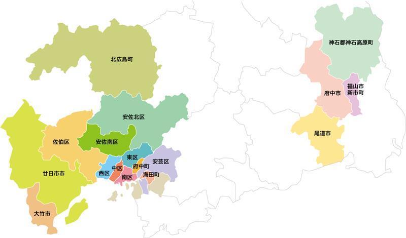 広島市、尾道市、福山市新市町、府中市、大竹市、廿日市市、安芸郡府中町・海田町、山県郡北広島町、神石郡神石高原町 |