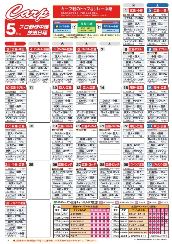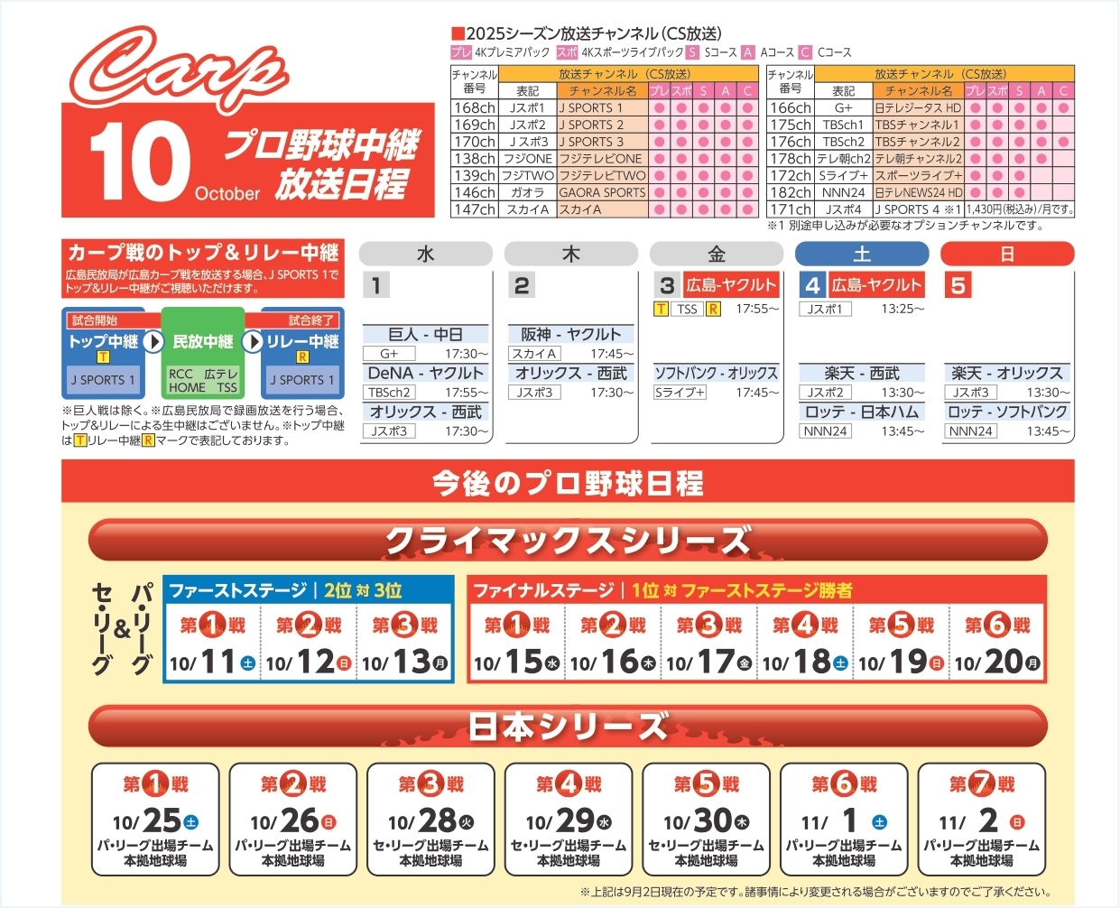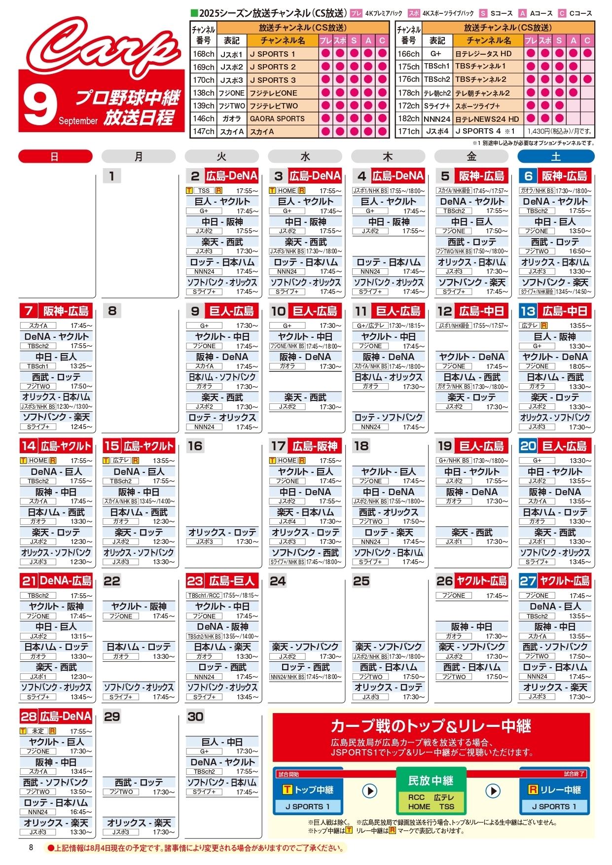 ※広島vs巨人戦は地上波、BS、その他CS(専門)チャンネルでの放送となる場合がございます。