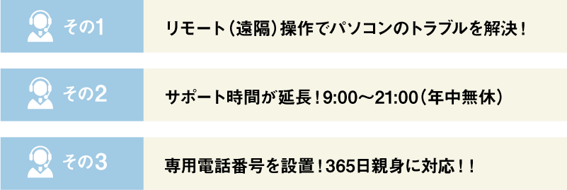 ※安心リモートサポートにご加入いただいた方のみ、専用電話番号をお知らせいたします。時間帯により電話が混み合う場合がありますのであらかじめご了承ください。