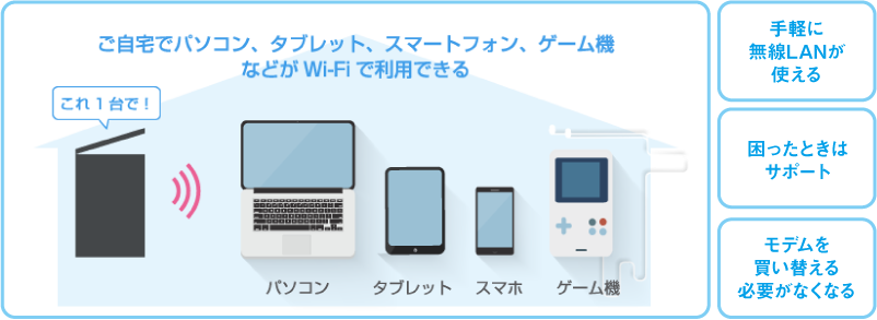 ご自宅でパソコン・タブレット・スマートフォン・ゲーム機などがWi-Fiで利用できます。