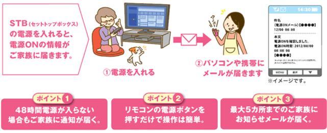 専用チューナーを設置したテレビの電源を毎日入れるだけで、離れて暮らす家族の携帯電話などへ自動的にメールが送信されます。普段の生活の中で大きな負担をかけず、気軽に見守りできて安心感を高めてくれる、広島初の商用サービスです。