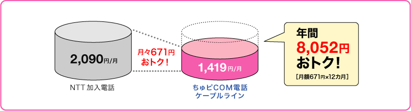 月額基本ご利用料金1,419円(税込み)※1。NTT西日本の加入電話:2,090円(税込み)※2と比べると、