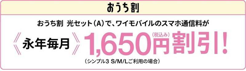 【適用条件】○ワイモバイル指定窓口に本割引をお申し込みいただくこと。 ○個人のお客さまであること。 ○モバイル通信サービスを対象料金プランでご利用中またはお申し込みいただくこと。 ○固定通信サービスを対象料金プランでお申し込み後180日以内に固定通信サービスが契約成立(開通)をすること(契約成立確認はおうち割 光セット(A)申し込み翌月より毎月1~2日の契約成立確認期間に行います。) ○お申し込みのお客さま、またはそのご家族が対象固定通信サービスの契約者で指定オプションをご利用中またはお申し込みいただくこと。 ※ご家族の方が本割引をお申し込みの場合、対象固定通信サービス契約者のご家族であることを証明できる確認書類が必要です。 〇お申し込みのあったモバイル通信サービスの回線数が、対象固定通信サービス1回線に対して10回線以内であること。 〇本割引お申し込み時に対象固定通信サービスの支払方法が登録されていること。 【特典】○適用条件が確認された当月利用分より割引を適用します。 ただし、契約成立確認期間までにモバイル通信サービス回線を解約された場合、適用条件を満たさないため 割引を適用することはできません。また、契約成立確認期間中におうち割 光セット(A)を解除および再申し込みした場合、再申し込みした翌月より契約成立確認を行います。 ○以下の割引、キャンペーンと重複して割引を適用することはできません。● おうち割 光セット(A)申込特典(重複する場合、本割引が優先して適用されます。)●光おトク割 ●家族割引サービス ●Wi-Fi セット割 ●タブレット割引(スタートキャンペーン向け) ○ケーブルラインでは、シンプル3 S/M/Lおよびシンプル2 S/M/L以外の対象料金プランは適用できません。【特典適用終了について】○以下のいずれかに該当する場合、当該事実が確認された当月利用分をもって割引の適用を終了します。 ● モバイル通信サービス回線を解約した場合 ●モバイル通信サービス回線を対象外料金プランに変更した場合 ●対象固定通信サービスや指定オプションの変更、解約、譲渡などにより、適用条件を満たさなくなった場合 ○以下に該当する場合、当該事実が確認された当日をもって割引の適用を終了します。 ●モバイル通信サービス回線を譲渡した場合 ○以下に該当する場合、当該事実が確認された時点で「おうち割 光セット(A)」の申し込みをキャンセルします。 【申し込みのキャンセルについて】●固定通信サービスのお申し込みから180日経過後も、契約未成立(未開通)または指定オプション未加入だった場合 【その他】○記載の料金額は税込み価格となります。消費税計算上請求金額と異なる場合があります。