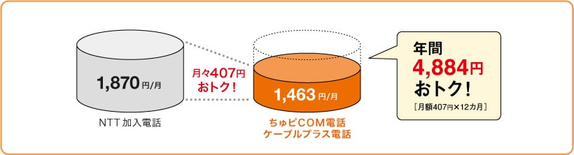 月額基本ご利用料金1,463円(税込み)※1。NTT西日本の加入電話:1,870円(税込み)※2と比べると、