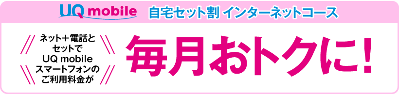 ●「自宅セット割 インターネットコース」はUQ mobileスマホの利用料金より割引となります。ご利用にはUQ mobile取扱店でお申し込みが必要です。