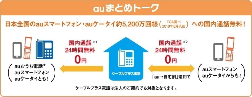 au携帯電話ご契約者のご自宅電話番号にケーブルプラス電話をご登録の場合、ご自宅あての通話が無料となります。