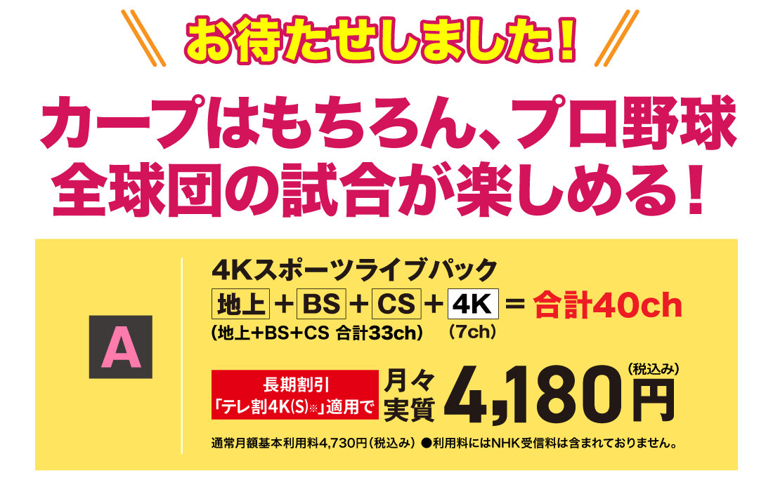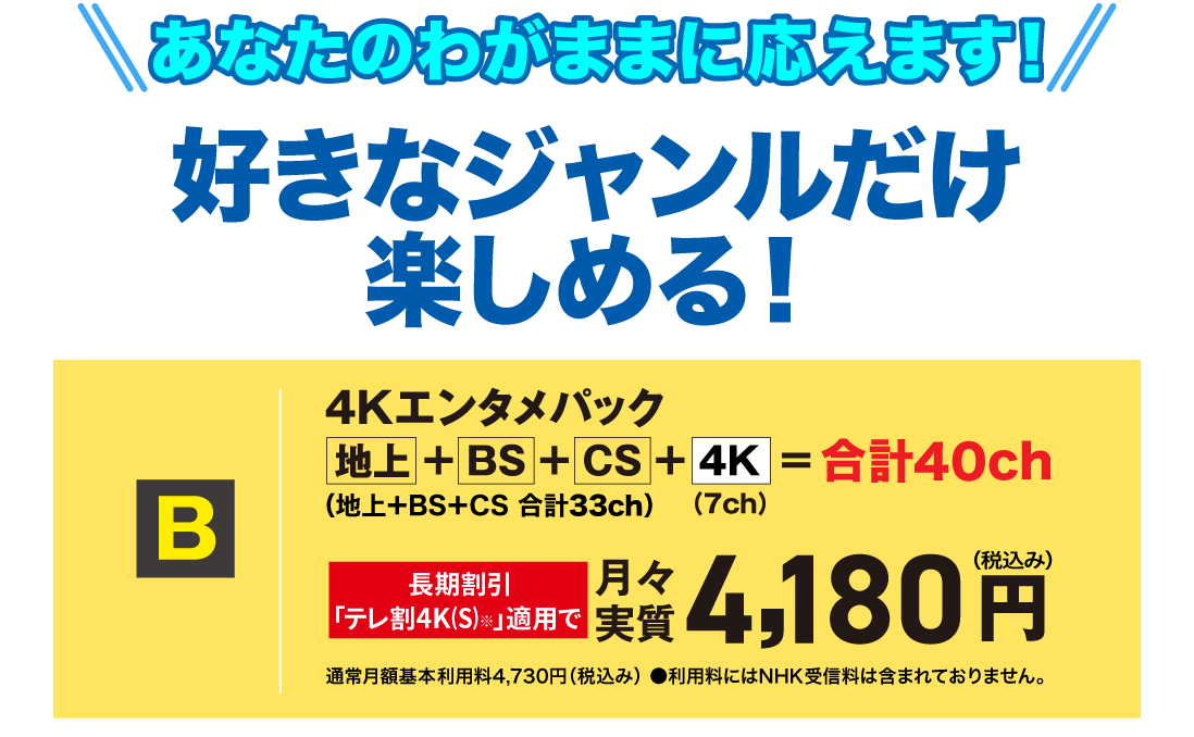 ※テレ割4K(S)は、4Kパックを2年間継続してご利用いただくことを条件に適用します。なお、期間満了前に対象サービスの契約を解除された場合には所定の解約料を請求いたします。詳しくはお問い合わせください。